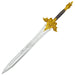 This sword belongs to the King during the First War and ruler of Storm Wind. It is constructed of polyurethane foam with a 10mm inner core. The inner core makes this sword durable and able to take blows without breaking. The Artisans painted this sword with such care that it emphasizes every detail to bring about a truly amazing piece. The pommel is golden with a unique tulip design. The grip comes in royal blue with golden accents befitting royalty. The cross guard is a regal lion with a full flowing mane and scroll work. The broad blade is painted silver with a fuller down the center. As a symbol of hope for the King’s guard to blade is a must. Wield this beauty as the finishing touch for cosplay or LARP costume.