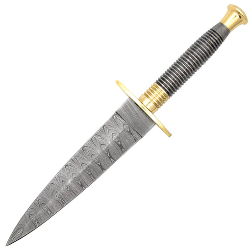 Full Damascus Steel Commando Knife with Brass Fittings and Leather Sheath