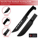 Have mercy when you are deciding the fate of another even if they are dinner. The Merciful Fate Sawback Hunting Knife has a sturdy full tang construction with a stainless blade making it an ideal hunting knife. This American tanto blade is a beauty but the partial sawback spine just makes it awesome. A tanto style blade gives you an extra cutting edge while hunting and camping in the outdoors. The benefits of a sawback allows you to saw away small limbs if need be. To protect the blade against rusting in all weather conditions is a black anodized finish which also is great for reducing glare. The handle has contoured wooden scales that are adhered with rivets. A quillion protects the users hand from slipping onto the blade and the pommel is curved under to prevent the knife from slipping out of your hand. Included is a durable nylon sheath with belt loop. The Merciful Fate Sawback Hunting Knife is a must have the next time you are out hunting with the guys.
